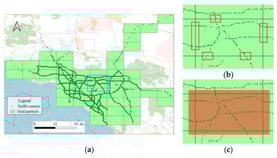 In this study, the traffic graph network is represented as , where denotes the set of road sensors, represents a set of connected edges between sensors. The adjacency matrix is defined as a binarised matrix (where is the number of sensors) representing the undirected adjacency relationships in the traffic graph. In this study, the geographical feature data of the sensors were utilised to partition the traffic graph into regions based on a latitude and longitude grid.