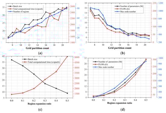 To determine the optimal grid partitioning strategy, this study systematically evaluates the impact of different partition counts and region expansion ratios on model performance. Partition counts ranging from 7 × 7 to 21 × 21 are examined. As shown in Figure 6a,b, the experimental results indicate that as the partitioning granularity increases, the number of nodes within each region tends to decrease, significantly reducing the model’s memory overhead, computational load, and parameter size. However, training time exhibits a non-monotonic trend—first decreasing and then increasing—owing to the trade-off between region traversal frequency and subgraph scale.