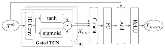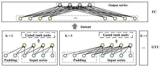Temporal information with different receptive fields is captured by stacking using convolutional kernels of various sizes, forming a multi-gated tanh convolution [18] with the architecture shown in Figure 9. Figure 10 illustrates the architecture of the multi-scale gated temporal convolution module. A total of different kernel sizes are set and the GTU output for a kernel size of is denoted as . The temporal dependencies across multiple scales are aggregated using the Cat method, then passed through the rectified linear unit () activation function to obtain the multi-scale temporal dependencies, denoted as , as follows: