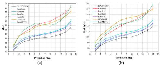 Ablation study results for (a) MAE and (b) MAPE for each prediction step.