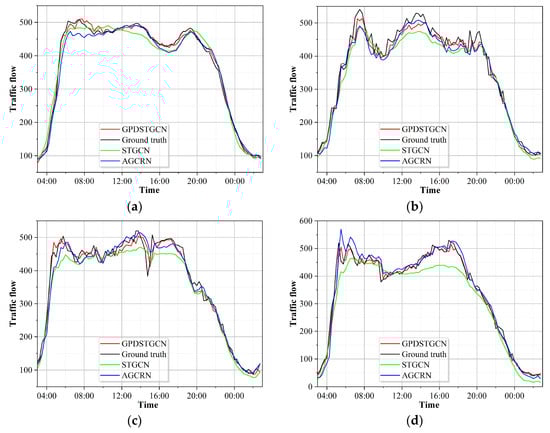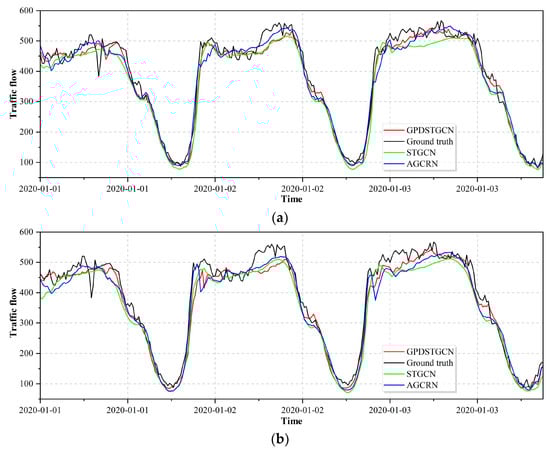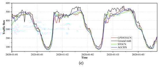 The errors between the predicted and actual traffic flows were determined to compare the accuracy of the proposed GPDSTGCN model with that of the well-performing STGCN and AGCRN models. Figure 12 shows the 15 min traffic flow forecasts versus the actual values from sensors located within and at the edges of regions. The results confirm that the partition-based approach ensured complete local adjacency relationships: the proposed model achieved a predictive accuracy comparable to that of STGCN and AGCRN, which utilise the entire graph GCN. However, STGCN does not account for dynamic spatial–temporal correlations, leading to a poorer predictive performance; in contrast, the proposed model includes a dynamic correlation module that better captured dynamic changes in traffic flow.
