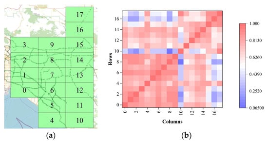 Figure 14a shows the spatial distributions of regions and sensors, and Figure 14b provides the Pearson correlation strengths between regions. The proposed model determined that region 10 exhibited strong correlations with adjacent regions 4 and 11 as well as with non-adjacent regions 16 and 17 owing to the structural similarities of the traffic networks in these areas. This confirms that the proposed model can effectively capture close correlations between adjacent regions while recognising potential connections between nonadjacent regions, thereby achieving a comprehensive understanding of both global and local spatial dependencies. Indeed, this capability significantly enhanced the generalisation ability of the model, mitigated overfitting issues, and improved the traffic flow forecasting accuracy.