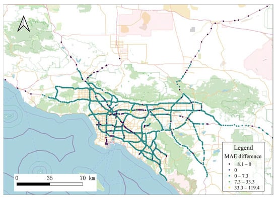 MAE differences between RemGlo and GPDSTGCN (RemGlo−GPDSTGCN).
