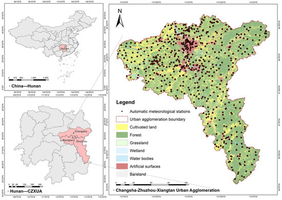 The CZXUA, situated in the east-central region of Hunan Province, encompasses three prefecture-level cities, five county-level cities, five county towns, and 165 organic towns [43] covering a total area of 28,087 km2, with geographic coordinates ranging from 26°03′ N to 28°41′ N, and 111°53′ E to 114°15′ E [41] (Figure 1). The CZXUA represents a critical component of the urban agglomerations within the middle reaches of the Yangtze River and serves as the central growth pole for economic development in Hunan Province. In 2022, occupying 13.3% of the province’s land area and housing 25.7% of its population, the CZXUA contributed 41.7% of the total GDP of Hunan Province. The CZXUA is situated in an area characterized by hot summers and cold winters and experiences a subtropical monsoon humid climate, marked by low temperatures and substantial rainfall in spring, high temperatures and intense sunlight in summer, drought conditions with scant rainfall in autumn, and cold, damp winters. Frequent occurrences of extreme heat are observed in summer, with temperatures occasionally exceeding 40 °C. Notably, Changsha is recognized as one of China’s four “furnace” cities [44]. In recent years, the rapid development of the CZXUA has led to expanding urban agglomeration, exacerbating the UHI effect, which significantly impacts the health of urban dwellers and the sustainable development of the urban agglomeration. An immediate construction of a CSP is imperative to alleviate the UHI effect.