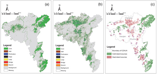 (a) Urban cold island patch types. (b) Urban heat island patch types. (c) Urban cold island and UHI sources.