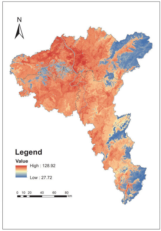 The magnitude of the resistance value quantifies the degree to which cold air circulation is facilitated or hindered within a given area, with lower values indicating preferential pathways for airflow and higher values reflecting thermal or structural barriers. Following the reclassification and valuation of the seven resistance factors, the cold island resistance surface was generated utilizing SPCA (individual resistance factor diagrams are shown in Figure A1, Figure A2, Figure A3, Figure A4, Figure A5, Figure A6 and Figure A7). Percentage and cumulative eigenvalues of the SPCA results (Table A4) show that the cumulative variance contribution rate of the first three principal components reached 96.76%, indicating that these components encompass most of the spatial variability information from the original data. Therefore, we selected the first three principal components to construct the resistance surface and reduce redundancy while retaining key spatial characteristics. Finally, the ventilation potential data were used to correct the resistance surface (Figure 6). The resistance values span a range from 27.72 to 128.92. Regarding spatial distribution, regions exhibiting higher resistance values are predominantly located within urban and rural construction land, whereas the cold island sources exhibit lower resistance values.