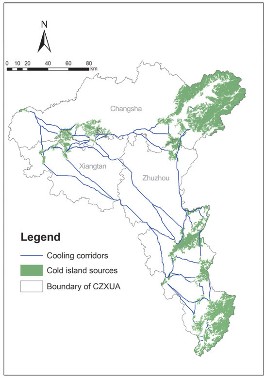 Based on LST, MSPA and landscape connectivity analysis were conducted, resulting in the identification of 39 cold island sources, as depicted in Figure 5c. The cold island sources exhibit a broad spatial scale, ranging from 1 km2 to 2019 km2 in individual area, with a total aggregated coverage of 4356.73 km2—representing 15.5% of the entire study region (see Table A3 for spatial distributions and area breakdowns). In terms of spatial distribution, the cold island sources are predominantly located in the eastern sector of Changsha, the central and southern regions, the southeastern area of Zhuzhou, and the northern region of Xiangtan (such as Jiuling Mountain Range and Lianyun Mountain Range). They are located away from urban built-up areas, exhibiting a distribution pattern of “peripheral concentration and core deficiency.” Most cold island sources are woodlands and mountain ranges, which overlap significantly with the large BGS of the CZXUA.