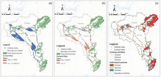 Circuit theory, a concept originating from physics, was initially introduced by the American scholar McRae for ecological studies and initially employed to forecast species inheritance [59]. It subsequently evolved to examine the random walk attributes of wildlife, utilizing the analogy of electrons’ random traversal within circuits to simulate species migration and dispersal processes. Consequently, circuit theory can be applied to pinpoint critical nodes within potential cooling corridor networks by modeling random flow dynamics [4,37,59]. Regions with higher current values are considered important cold and hot spaces (cooling nodes, heating nodes).