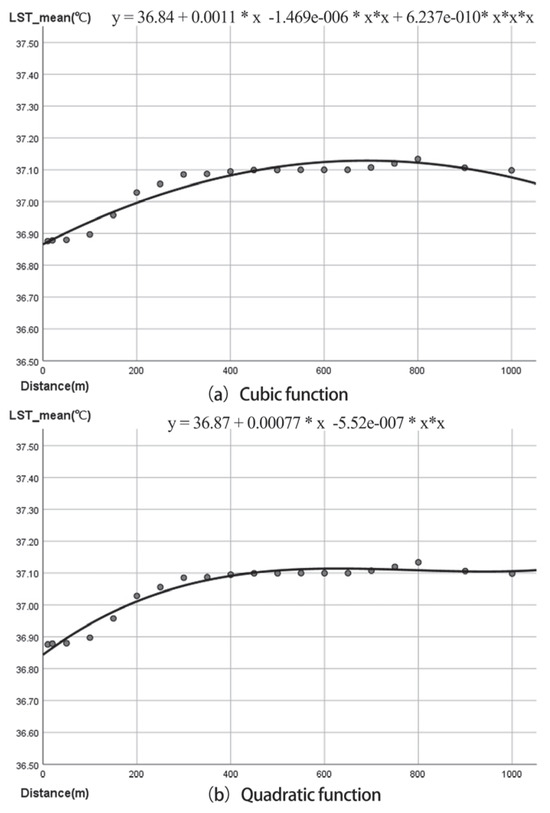 Using average LST as the dependent variable and corridor width as the independent variable, curve estimation was performed to identify the best-fitting function. Results showed that quadratic and cubic functions achieved superior model fit (R2 = 0.939 and 0.962, respectively) (Table 5). Based on the polynomial functions illustrated in Figure 9 and considering constraints from planning policies and construction costs (as corridor width cannot expand indefinitely), the optimal threshold for cooling corridor width was determined to be 600 m.