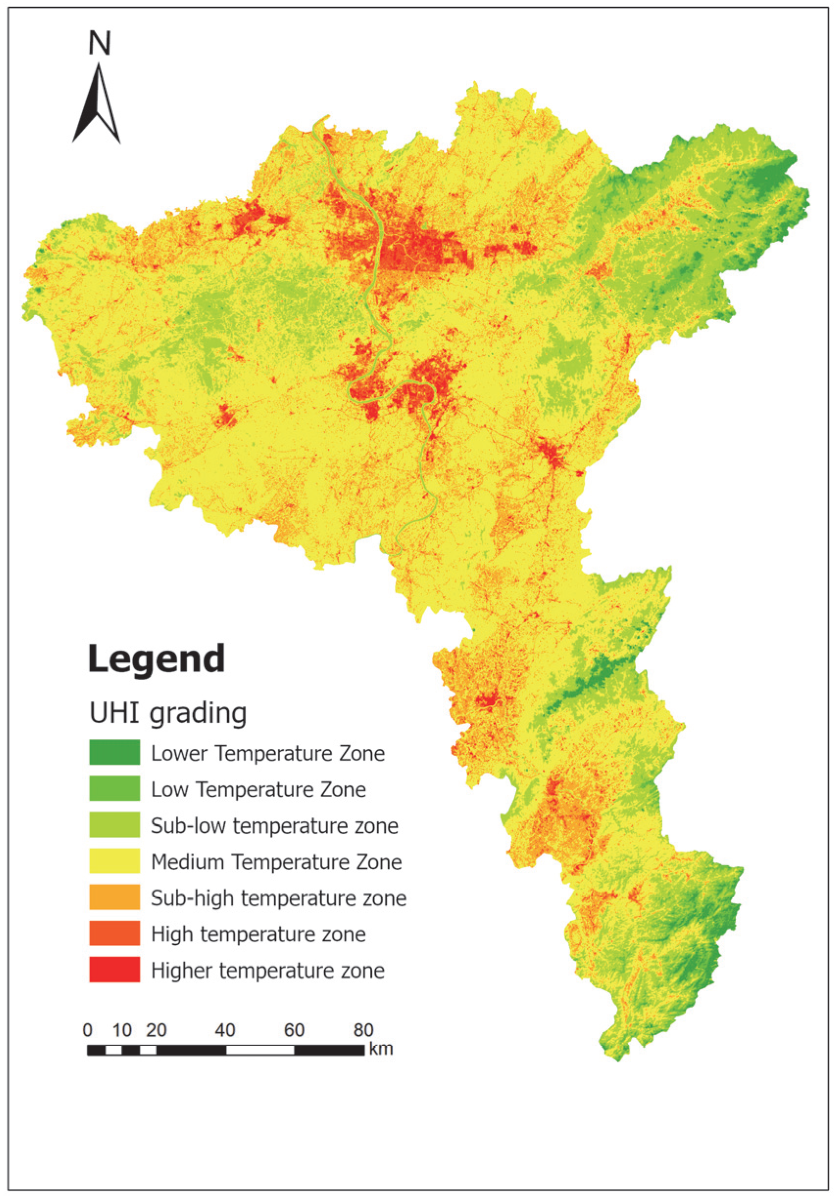 To elucidate the characteristics of LST spatial distribution with greater clarity and precision and to mitigate the impact of extraneous variables, such as the timing of data acquisition and meteorological conditions, on the estimation of surface temperatures. It is imperative to implement a grading process for the surface temperature estimation results and to ascertain the UHI grade. Currently, UHI grading methodologies are primarily categorized into two approaches. The initial approach is the equidistant division method, characterized by a significant degree of subjectivity in determining division parameters, potentially leading to inaccurate categorization. The second method, which has garnered widespread adoption, is the mean–standard deviation approach, facilitating precise UHI classification through the judicious integration of LST’s mean and standard deviation within the study area [37,53]. Accordingly, this study employed the mean–standard deviation method for grading surface temperatures. It classifies the inverted surface temperatures into seven distinct grades, utilizing ±0.5 sd, ±1.5 sd, and ±2.5 sd as the demarcation points (Table 3).