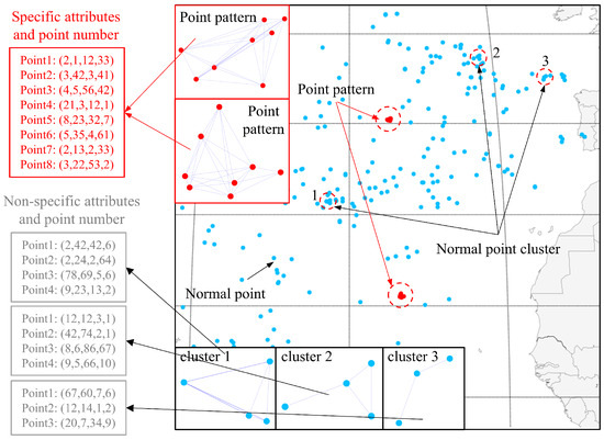 Raw spatial vector data sample. Point patterns are represented by red dots and normal points are represented by blue dots. Normal point clusters consist of normal points with strong aggregation characteristics, as shown in the three illustrations of normal point clusters below. In comparison to the irregular point clusters, point patterns have a specific number of points with point attributes, as shown in the two illustrations in the upper left corner.