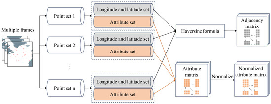 Flowchart of the graph conversion procedure. The raw spatial data are divided into multiple point sets by frames. The latitude and longitude set of each point set generates the adjacency matrix. The attribute set generates the normalized attribute matrix.