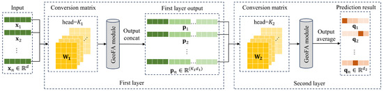 By adding multiple independent attention modules, the model can allocate attention to multiple relevant features between the center point and neighboring points, which enhances the model’s learning ability. The structure of the proposed GeoFAN method is shown in Figure 4. We used two multi-head graph attention layers to map the attribute network in low dimensions. The output of each GeoFA module in the first layer is obtained by splicing, and the output of each GeoFA module in the second layer is averaged to obtain the prediction results. The first layer output and the second layer output of the ith point are represented as follows: