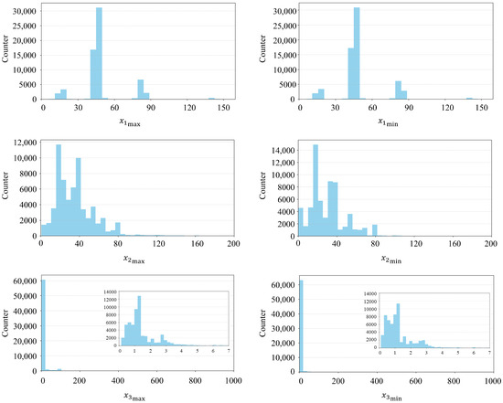 The point attributes contain three main types of parameters: , , and . In practical scenarios, such as electromagnetic satellite signal detection, the target attributes contain the maximum, minimum, and average values of the signal during the observation time, with the maximum/minimum reflecting the fluctuating range of the signal attribute, and the average reflecting the signal attribute under its steady-state operation, which together define the fingerprint of the target. However, due to the sparsity of the actual data and the lack of a priori knowledge of the target, the true average value distribution is difficult to predict. To simulate the randomness of average values in real scenarios and ensure the generalization ability of the model under limited data, we selected nine parameters: , , , , , , , , and . The statistical parameters we set for all the points are shown in Figure 5. The average values of three parameters are randomly generated were between the maximum and minimum values to cover all possible average values in real scenarios.