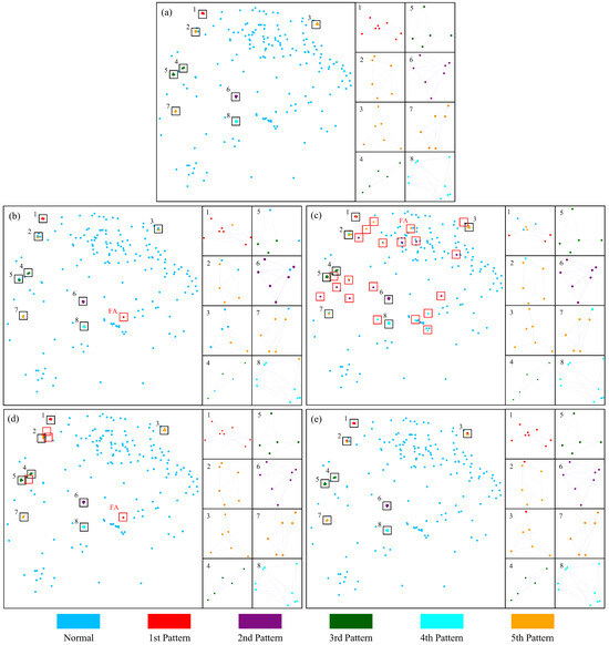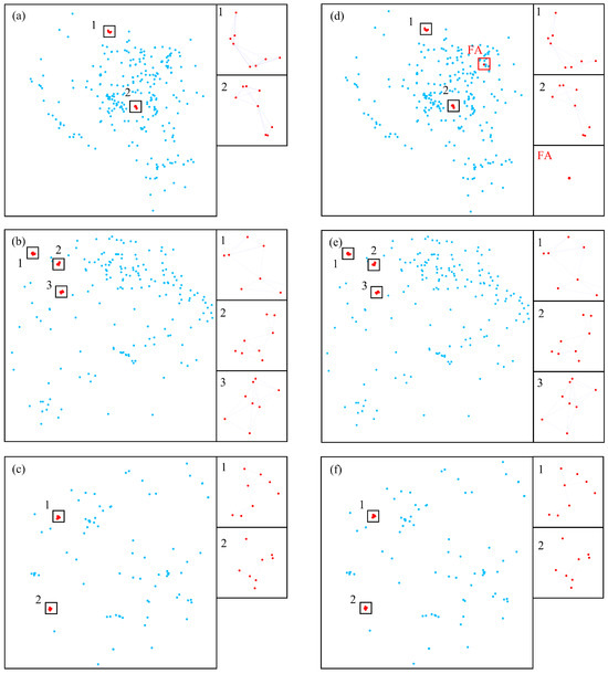 Recognition results of maximum patterned point spacing of 100 km. The red dots are patterned points and the blue dots are normal points. FA represents false alarm. (a–c) Ground truth of frames 1, 2, and 3, respectively. (d–f) Recognition results of frames 1, 2, and 3, respectively.