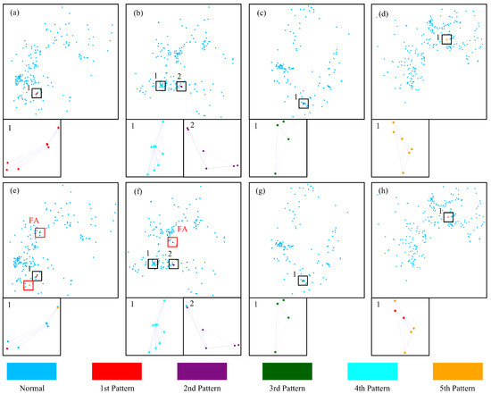 Recognition results of 5 types of point patterns based on real location-based data. (a–d) Ground truth of frames containing 5 types of point patterns. (e–h) Recognition results of frames containing 5 types of point patterns.