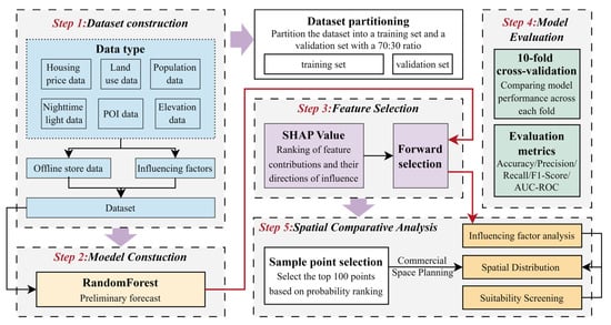 The overall research framework of this study is illustrated in Figure 2 and is divided into five main steps: dataset construction, feature selection, model building, model comparison, and spatial comparative analysis. First, the study area was processed by grid division and overlaid with multiple spatial datasets to construct a geographic dataset. A feature matrix was then created by extracting the grids containing the research objects along with an equal number of negative sample points. Next, the dataset was split into training and testing sets at a 70:30 ratio [64]. Based on the initial RF model, features were ranked according to their importance scores derived from SHAP values. Starting with the top-ranked feature, variables were incrementally added one by one to build models with increasing dimensionality. For each subset of variables, 20% of the training set was used as a validation set, and model performance was evaluated using accuracy. The subset that achieved the highest accuracy on the validation set was selected for the final model. Subsequently, the RF model was trained on the filtered training set, and its performance was evaluated on the test set. The best-performing model was then selected for final use. Lastly, the suitability for site selection across all grids within the study area was predicted. A set of highly suitable sample points were selected as potential site locations. The distribution of high-probability points was examined using Shanghai’s commercial spatial planning, and a comparative analysis was conducted with actual distribution patterns to test the relative suitability of their layouts.