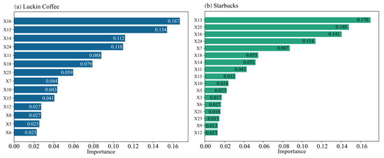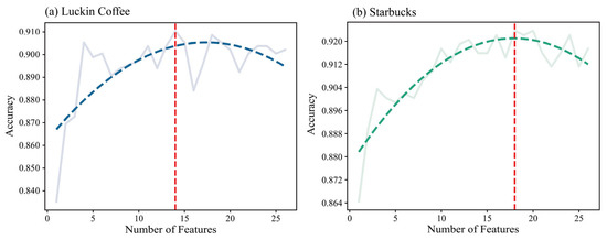 The selected RF model was applied in the forward feature selection process. As shown in Figure 5, the accuracy of the Luckin Coffee model reaches its peak at 0.910 with 14 features, while the Starbucks model achieves its highest accuracy of 0.924 with 18 features.