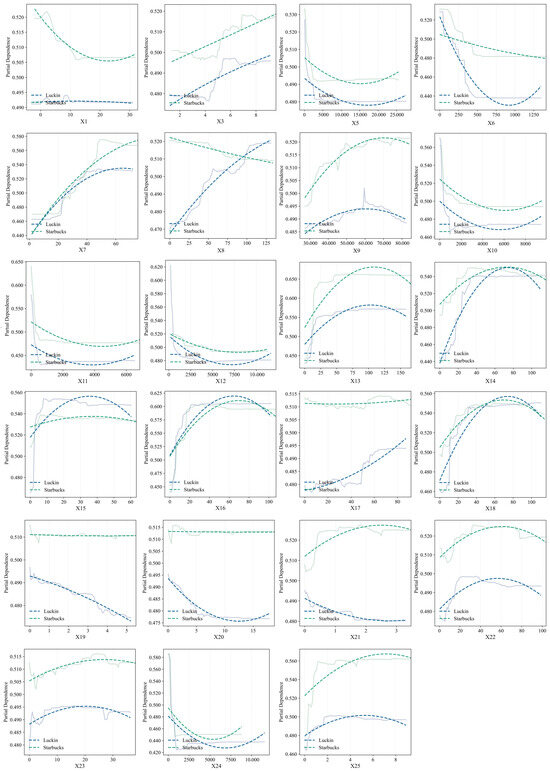 In terms of urban functional zones, the fitted curves of both brands show similar distribution patterns for dining services (X14), science and education cultural facilities (X16), and life services (X18), indicating that their market strategies and consumer appeal are relatively aligned in these areas. However, there are notable differences in peak values for transportation facilities (X13), residential areas (X15), and corporate businesses (X23). Starbucks exhibits a stronger attraction to high-traffic and office-dense areas, whereas residential areas contribute more to Luckin’s distribution. Notably, leisure facilities (X21) have completely opposite effects on the two brands. This contrast may stem from the fact that Starbucks’s store locations often signify a vibrant commercial atmosphere and high population activity. Areas with dense transportation, office spaces, and leisure facilities present stronger growth potential compared to residential neighborhoods, as visitors to these locations tend to have higher spending power.
