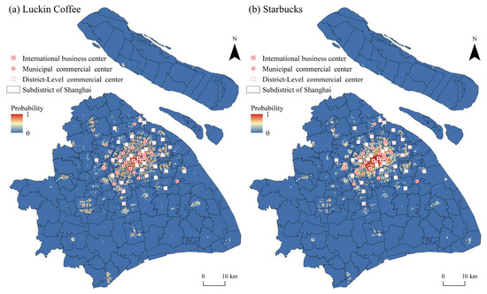 Commercial consumption clusters, as the core framework for constructing urban consumption space networks, play a crucial role in supporting economic development. Therefore, this study uses the international-, municipal-, and district-level commercial centers, as defined in Shanghai’s commercial spatial planning, as reference urban planning landmarks for site selection. The average probabilities for these centers were calculated. As shown in Table 7, both brands exhibit probabilities exceeding 0.7 around international and municipal commercial centers, which are significantly higher than their respective probabilities around district-level centers. Consequently, this study adopts international-level commercial centers and actual commercial centers as landmarks for subsequent fine-scale site selection.