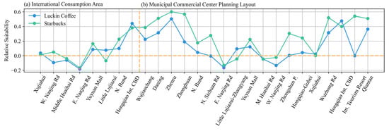To further refine the high-probability points, this study calculates kernel density values for existing stores and normalizes them as realistic suitability. By subtracting realistic suitability from the estimated suitability derived from the calculated probabilities, we obtain relative suitability, which is used to evaluate whether high-probability points around commercial centers are viable for site selection. From Figure 10, it can be observed that Luckin Coffee exhibits relative suitability values below 0 in international commercial centers such as East Nanjing Road, West Nanjing Road, and Middle Huaihai Road. In the Xujiahui international commercial center, the relative suitability approaches 0, indicating that although these areas have high site selection probabilities, opening new stores in these regions would face considerable pressure. On the other hand, Starbucks still has the potential to open new stores in the West Nanjing Road international commercial center.