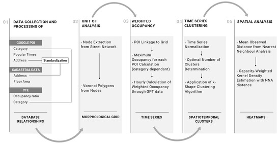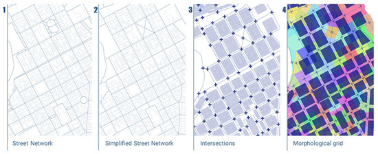 The unit of analysis for this research, the elaboration steps for which are shown in Figure 4, is based on a grid system adapted to the city’s urban morphology. This irregular grid was generated using Voronoi polygons originating from street intersections, which are the strategic points of connection and decision for people in motion [72]. Thus, such clear visual joints provide a fine-grained delimitation of functional nodes, maintaining relative spatial homogeneity rather than relying on a delimitation based on urban blocks, which would consider only a single facade for each street they encompass.