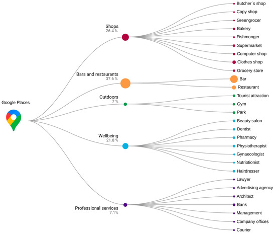 Figure 3 shows a branched diagram that categorizes the searches carried out using Google Places, grouped into five main classes. This classification—bars and restaurants, shops, wellbeing, professional services, and outdoors—was defined to synthesize the multitude of highly specific categories provided by Google Places into broader functional groups, allowing for a more coherent and interpretable analysis of urban activity. The diagram also displays the number of POIs within each class and their percentage relative to the total.