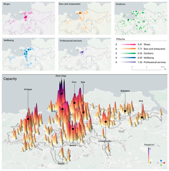The findings demonstrate that by analyzing geolocated, time-stamped big data, it is possible to model the activity patterns of specific urban nodes. This methodology enables detailed spatiotemporal analysis, offering valuable insights into the hourly behavior of people in a city in relation to urban form and its functions represented by spatially related POIs. The estimation of the volume of people, using category-dependent density ratios and the floor area of POIs, weighted by GPT data allows for an hourly capacity calculation of each location. This approach involves a reverse-engineering process using percentage values provided by Google from aggregated and anonymized data, all of which is publicly accessible.