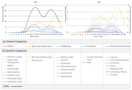 Street-level urban uses in Donostia-San Sebastián consist of a variety of activities with differing operating hours throughout the day [68]. The majority of these businesses include retail, hospitality, and auxiliary professional services, followed by public services. This commercial diversity is highly concentrated in the denser neighborhoods located in the flatter areas of the city, making it a prime area for studying urban dynamics.
