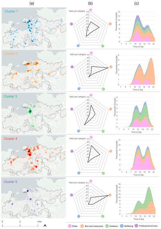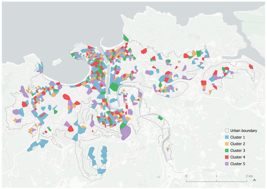 Finally, heatmaps were used to explore the spatial distribution of the resulting clusters. This spatial smoothing technique highlights concentrations and dispersions of activity types across the city, offering an intuitive visualization of functional zones and their morphological context. This integrative approach supports both analytical rigor and spatial interpretability, laying the groundwork for linking usage patterns to planning considerations.