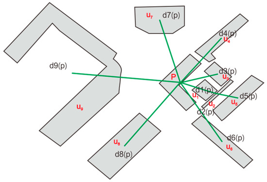 This paper further defines the neighborhood relationship of a building, selects a building node p as the starting point, calculates its shortest path distance from other nodes based on the graph structure, and arranges the path distances of all other nodes. The k-neighborhood collection of node p is composed of the first node to the k-th node of the sorting result of path distance, arranged in order of distance from small to large. The path distance between node u1 and node p is the minimum, and it is denoted as d1(p), as illustrated in Figure 2.