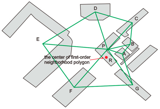 In the formula, A and i represent the buildings at both ends of their incident edge, d(A,i) is the closest distance between buildings A and i, and and are the inner widths of buildings A and i. For complex polygons, this inner width is difficult to calculate. In this study, the mean radius is used to represent the inner width. The mean radius means the average distance from each vertex of the building to its centroid [44].