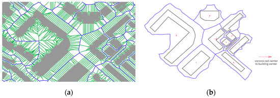 To produce Voronoi diagrams for buildings, this paper implements Wu’s methodology [42]. Initially, the boundary contours of all buildings are interpolated, and the ID of the building is designated to each interpolation point. Subsequently, generate Voronoi diagrams by utilizing these interpolation points as the occurrence elements. The ID of the point is the ID of each Voronoi diagram unit. Then, merge Voronoi diagrams with the same ID to obtain the Voronoi diagram of the building. Figure 4 illustrates the buildings and their corresponding Voronoi diagram unit.