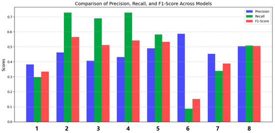 In Figure 10, the horizontal axis denotes the combination of training features, comprising eight distinct categories. Each combination of features is linked to a model training, labeled as Model 1 to Model 8, while the vertical axis shows the evaluation metrics for binary classification, which are precision, recall, and F1-score. Based on the three measures, Model 8 performed the best, indicating that training buildings require using all seven features together to improve results.