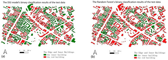 The binary classification results of edge and inner buildings: (a) DGI; (b) Random Forest.