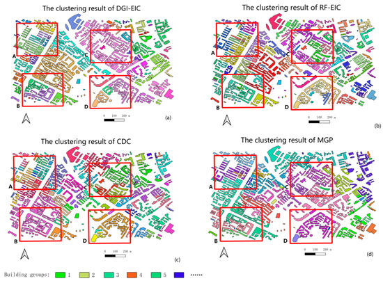 Comparison of the results of four clustering methods: (a) GGI-EIC; (b) RF-EIC; (c) CDC; (d) MGP. Select the four local areas A, B, C, and D in the red box in the figure for comparison. Buildings labeled with the same color are considered to be in the same group.