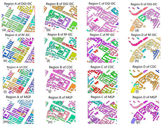 As shown in Figure 13 below, the four local regions A, B, C, and D of the test data set are selected from the test data set to further prove the reliability of the clustering results of the DGI-EIC method. Each column in Figure 13 represents a region of the test data set, and each row represents the clustering results of different methods in this region. We observe column by column. First, it is region A column; Figure 13a is the result of the DGI-EIC method, and Figure 13e is the result of the RF-EIC method. These two methods have better results in identifying E-type clusters in the upper left corner of area A (in Figure 13a is a green cluster, and in Figure 13c is a blue cluster). The results of this recognition are consistent with the cognition of human vision. Neither the CDC technology (Figure 13i) nor the MGP method (Figure 13m) correctly identified the E-type building group in the upper left corner of Area A. Then, we observe the region B column. The purple region in Figure 13b indicates that the DGI-EIC method has certain defects. The two clusters are mistakenly identified as one cluster, and Figure 13f identifies the region as green clusters of different tones. The RF-EIC result is closer to the square block division shape. For Region B, Figure 13j shows that the CDC method cannot recognize local fine cluster shapes and recognizes this area as a cluster. The red and green clusters in Figure 13n are wrong building group recognition results. Next, in the Region C column, Figure c recognizes a large area; however, the cluster shapes identified by Figure 13g do not conform to human visual cognition. Additionally, the clustering results displayed in Figure 13k,o are subpar, indicating that these four methods are ineffective for clustering in region C. Finally, in the Region D column, Figure 13d recognizes four distinct clusters, while Figure 13h mistakenly identifies the three clusters from Figure 13d as a single cluster, which clearly shows a gap in the middle of this combined cluster. Obviously, the recognition result of Figure 13d is better, and the problem of excessive recognition range of the same cluster also occurs in Figure 13l,p, which means that the clustering effect of the DGI-EIC method is better for region D.