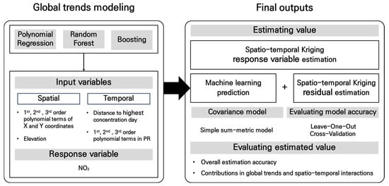 The integration of machine learning techniques and kriging methods improves estimation accuracy [1,2]. Expanding spatio-temporal dimensions increases modeling complexity compared to purely spatial models [3]. Traditionally, polynomial regression or trend surface analysis has been commonly used to remove global variation trends to achieve stationarity in kriging [4]. While traditional methods offer simple and comprehensive estimates, these conventional methods often lack the flexibility to capture complex and non-linear spatial and temporal patterns. In contrast, machine learning techniques effectively address these variations [5]. Accordingly, applying machine learning to spatio-temporal kriging enhances the accuracy of estimating variables, particularly environmental ones such as air pollution, which exhibit complex and non-linear seasonal variations in emission sources [6,7,8,9].