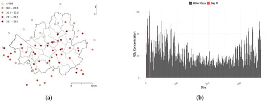 (a) The spatial distribution of air quality monitoring stations and their average NO2 concentration. (b) Daily average NO2 concentration during the study period.