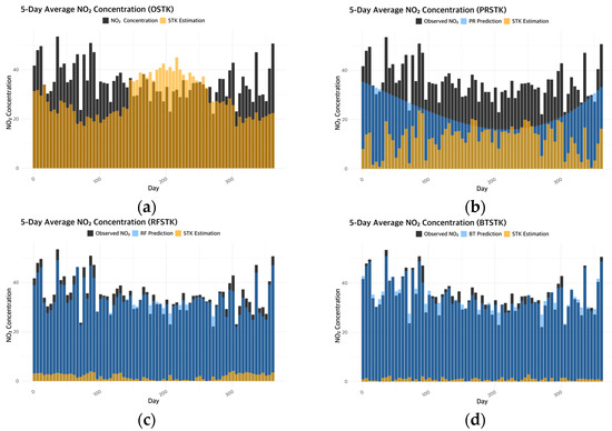 PRSTK tends to estimate smooth temporal global trends, in contrast to the relatively abrupt patterns observed in RFSTK and BTSTK. At the selected monitoring station, although the observed NO2 concentrations exhibit local temporal fluctuations, their overall levels tend to be higher in spring and winter and lower in summer and fall. The global trends estimated by PRSTK using polynomial regression (blue bars in Figure 3b) provide a smooth representation of the general seasonal trend. However, it fails to account for local fluctuations, resulting in relatively large residuals on days with elevated NO2 levels during summer and fall. In contrast, RFSTK and BTSTK effectively capture localized temporal variations rather than general seasonal trends, yielding global trends estimates that appear more abrupt compared to those of PRSTK, while still producing relatively small residuals (blue bars in Figure 3c,d).