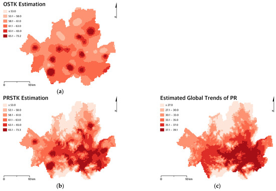 Second, the final interpolation results, which incorporate both global trends and spatio-temporal interactions, also display distinct patterns across STK methods. PRSTK shows a noticeable difference from its global trends-only estimates and maintains a smooth spatial pattern. For comparability, the maps were constructed using consistent classification intervals. Specifically, at the selected date, the global trends in PRSTK appear to be underestimated, and the final prediction is obtained by summing this underestimated trend with the spatio-temporal interactions estimates. The STK component of PRSTK shows a spatial pattern similar to that of OSTK (Figure 4a), which assumes constant global trends across the study area. As a result, clusters of high NO2 concentrations form around monitoring stations with high global trends estimates (Figure 4b). Because both the global trends and spatio-temporal interactions estimations in PRSTK exhibit smooth spatial trends, the final interpolated surface also reflects this pattern.