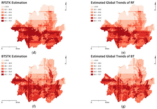 BTSTK and RFSTK yield results that are more consistent with their global trends predictions and produce more abrupt patterns compared to PRSTK and OSTK. Specifically, RFSTK and BTSTK account for a substantial portion of the spatial variation through their global trends, resulting in final interpolation outputs that closely resemble their global trend estimations, apart from the presence of moderately expanded clusters of high values. Comparing the two methods, RFSTK produces relatively larger clusters (Figure 4d), likely due to the larger spatial range identified in its semivariogram analysis, while BTSTK maintains more localized clusters (Figure 4f). Both methods, consistent with their global trends estimates, yield abrupt and linear spatial patterns that reflect the inherent structure of tree-based machine learning [31].