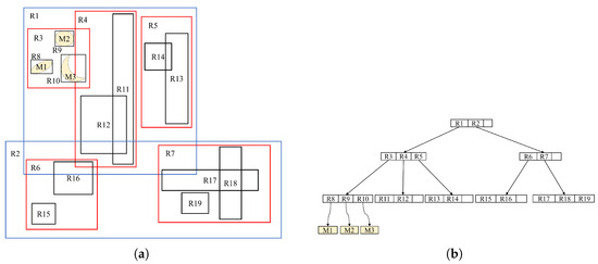 R-tree structure: (a) Division of MBRs of spatial objects. (b) Structure of the tree.