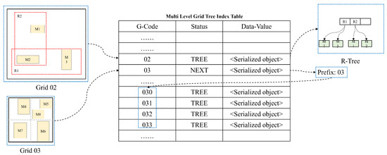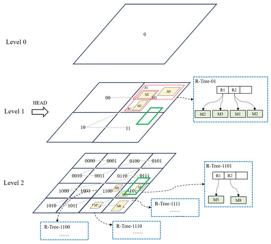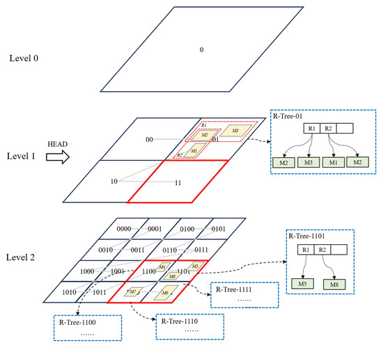 Storage structure of the multi-level grid and R-tree hybrid index model.