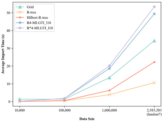 The performance of different indexing methods for data import on the simulated datasets and the Landsat 7 dataset is shown in Figure 7. The R-tree method demonstrated the best performance during the data import process and its time consumption grew relatively slowly as the data scale increased, indicating good scalability. In contrast, both the R-MLGTI and the grid-indexing methods exhibited significant increases in time consumption as the data scale grew, reflecting poor scalability.