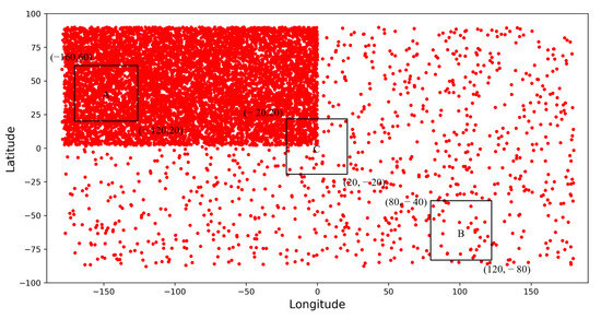 In the experiments on the simulated dataset, regions A, B, and C, as shown in Figure 8, were selected for query benchmarking. Each of the selected test regions A, B, and C corresponds to an MBR of 40° × 40° in size, with distinct characteristics. Region A has a relatively uniform and dense data distribution, region B has a relatively uniform but sparse data distribution, and region C has an uneven data distribution. Although the distribution of these three regions can only be determined after knowing the data locations, during the incremental insertion of data, these regions encompass all possible query areas at a certain retrieval moment.