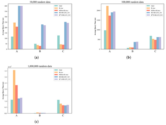 The performance of R-MLGTI on various simulated datasets is shown in Figure 9. At first, R-MLGTI’s query efficiency was worse than that of the other methods on small-scale simulated datasets, but as the data size grew, its performance gradually surpassed that of the other two methods. Taking 1,000,000 simulated data points as an example, the average performance of each method across three query regions (A, B, and C) was as follows: R-MLGTI took an average of 6409.66 microseconds, which was 56.80% faster than the R-tree method and 14.85% faster than the grid-indexing method.