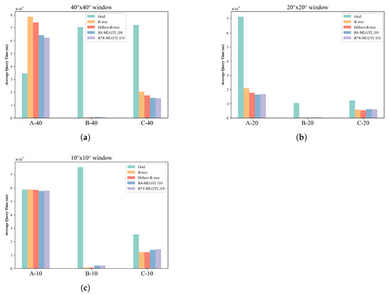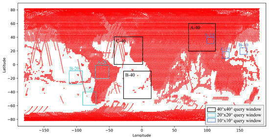 On the Landsat 7 dataset, we selected different query window sizes: 40° × 40°, 20° × 20°, and 10° × 10°. As mentioned in Section 4.2, the data over the land is more concentrated, while the data over the ocean is sparser. Therefore, we defined three different regions, A, B, and C, on the same query window size, located in the land area, the ocean area, and the land–ocean boundary area, respectively. As shown in Figure 10, “A-40” represents a 40° × 40° window size located in the land area with dense data distribution.