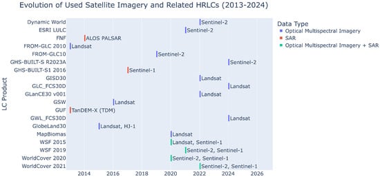 Evolution of used satellite imagery and related HRLCs from 2013 to 2024.