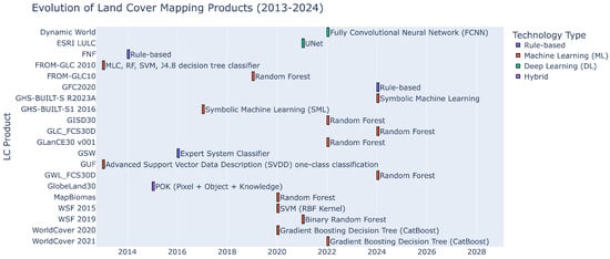 Automatic classification methods are a crucial step for the generation of reliable land cover maps by the analysis of pre-processed satellite images. From traditional rule-based and statistical techniques, to more automated and scalable machine learning and deep learning models, classification methods have undergone a major transformation, which reflects technological progress and the shift to more sophisticated data-driven techniques. This section will analyze the main techniques and methods used in the studied HRLCs (as shown in Figure 2), explore the historical development of classification techniques and their impact on land cover mapping, as well as the present trends.